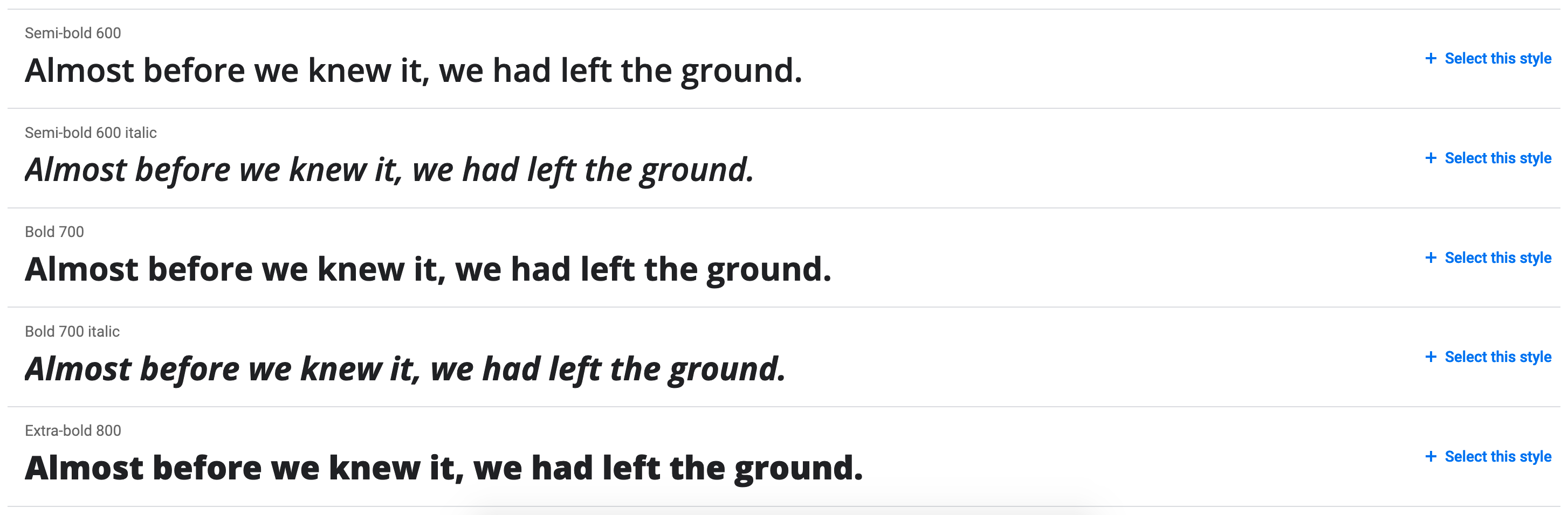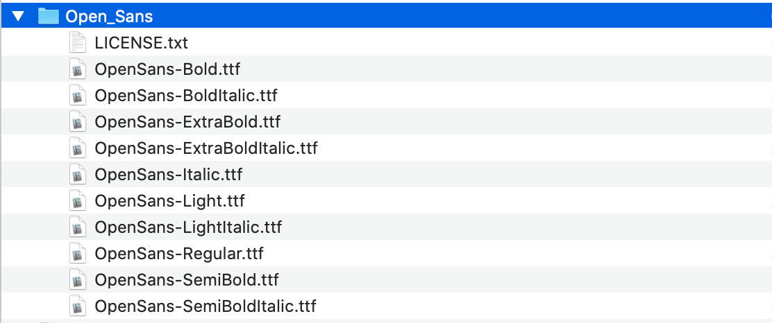 Итак, куча разных вариантов. По сути, каждый вариант — это и есть шрифт, входящий в семейство Open Sans.
