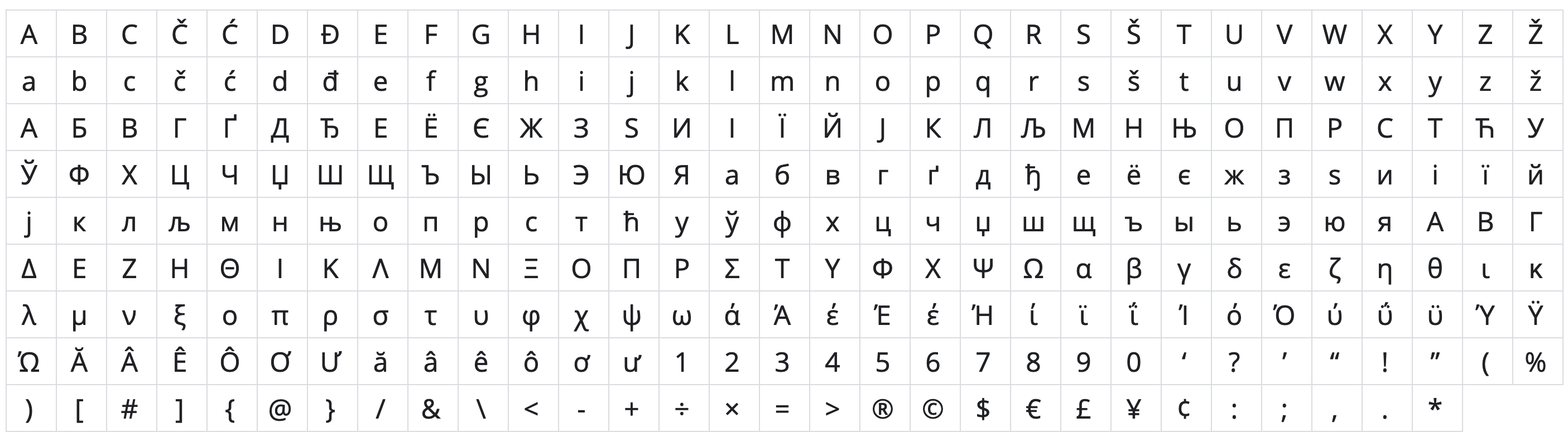 Чуть ниже находится список глифов — букв и символов, которые есть в этом семействе (но нам это важно, только если мы захотим упороться на оптимизации):
